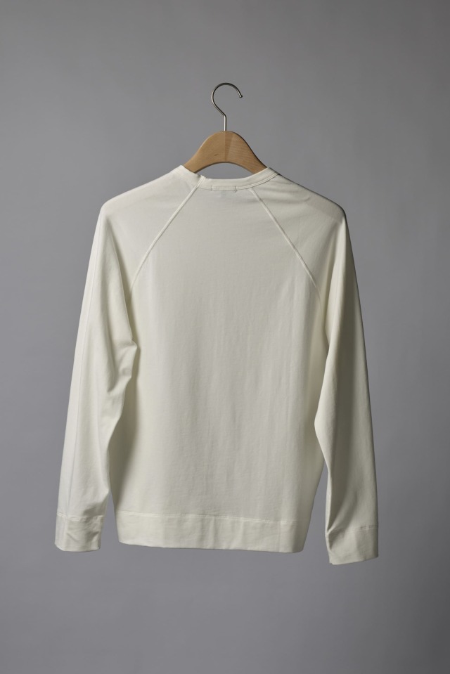 ラグランスリーブでカジュアルさを出しつつ、メリヤス素材で落ち着きも醸し出すロングスリーブTシャツ。